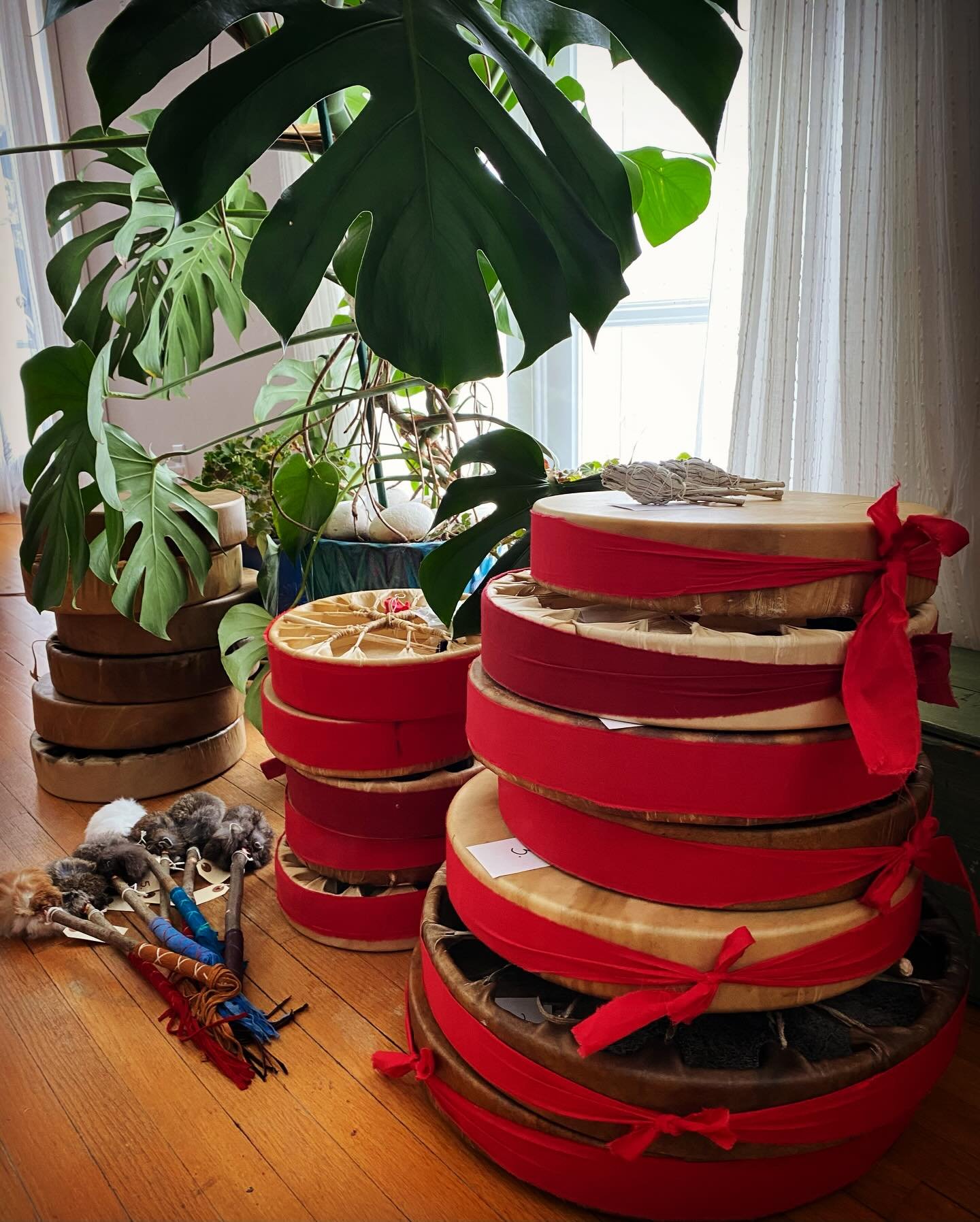 Once sacred space has been opened and everyone has voiced their presence in the circle we will receive the materials for bringing these tools through. The first step is to make the holes and sew them together. We will be filling them with sand to take the desired shape and let them dry while having lunch and embarking on a journey with our hosts, Suey and Lisa. They will lead us through a restorative and transformative sound healing journey, where you'll travel to a deeper state of consciousness connecting you to the vibrations of the mighty elk & its ancient energies. The synergy of sound and intention opens a pathway for you to explore the realms within yourself, fostering a connection with your inner guidance and connecting with the transformative healing energies of your sacred rattle.